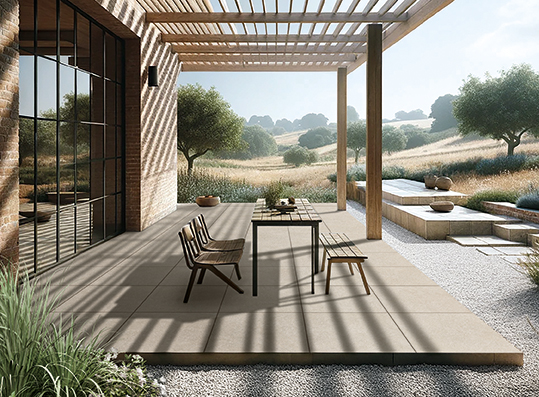 Površina z učinkom kamna daje prostoru eleganco in poudarja materialnost materiala.